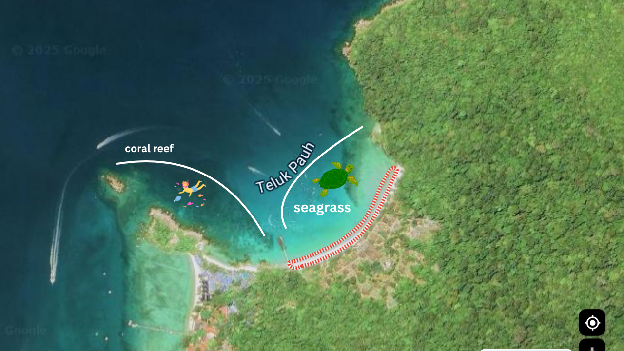 The seagrass meadows are super easy to snorkle. It is very shallow with very little currents. When snorkeling on your own, watch out for the boats and where they let their guests jump in. The captains know where the turtles are, so that you do not have to exhaus yourself swimming up and down Teluk Pauh looking for the turtles. Stay within the ropes. There is busy boat traffic outside of the ropes.