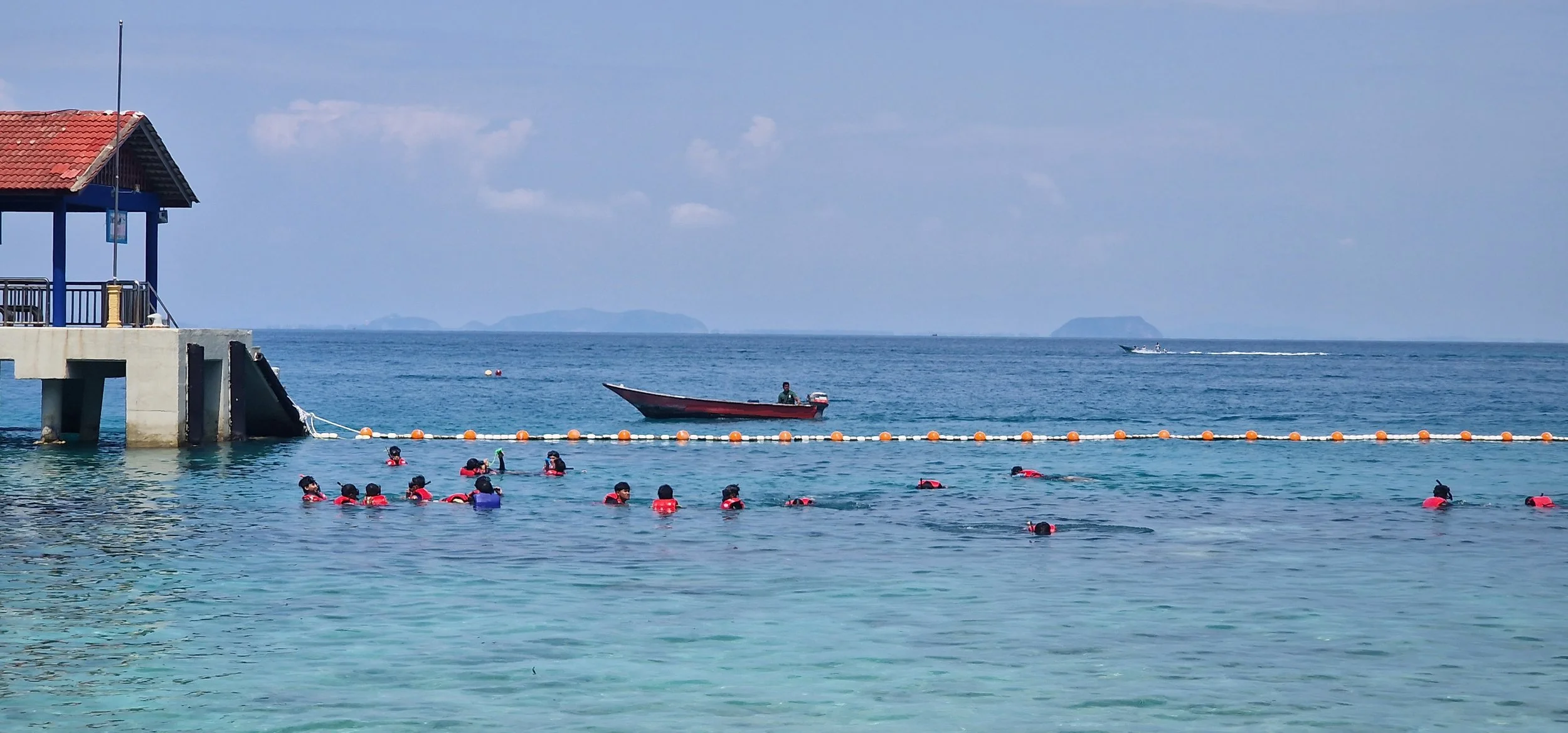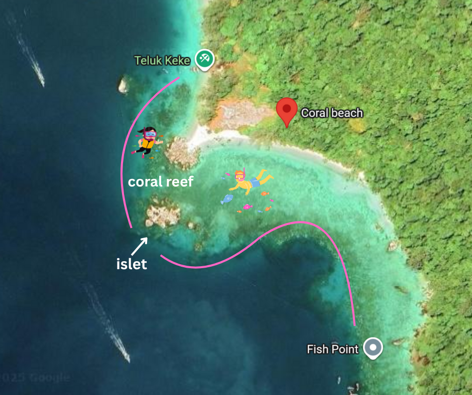 Snorkel within the pink line. There is some heavy boat traffic further out in the sea. The corals and many beautiful fishes can be found around the islet.