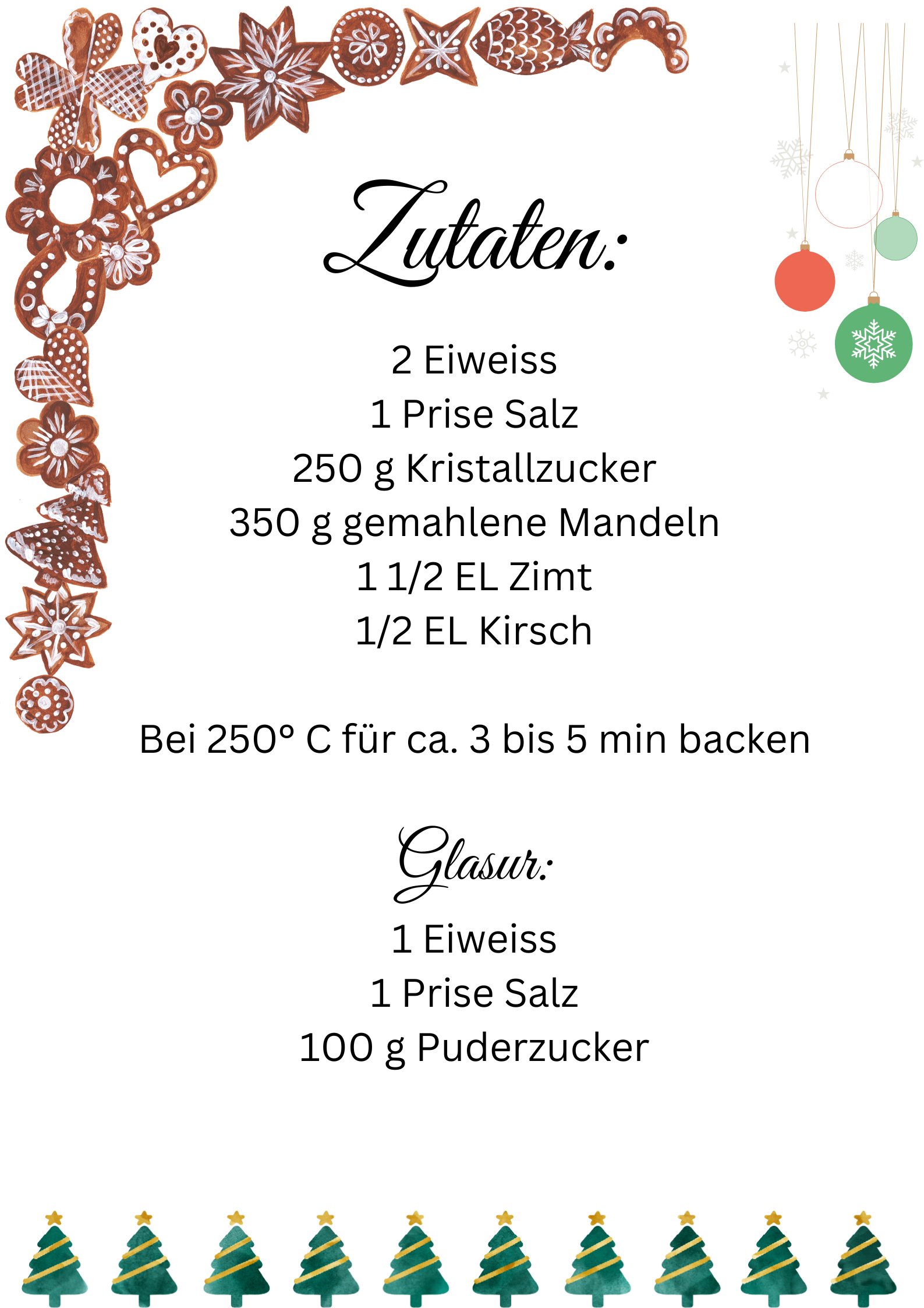 bei und verknete alles zu einem Teig. Auf einer sauberen, mit Kristallzucker bestreuten Arbeitsfläche den Teig mit einem Wallholz ca. 1 cm dick ausrollen und Sterne ausstechen. Das Förmchen mit etwas Wasser benetzt, dann lässt sich der Stern besser aus der Form lösen. Die Sterne fünf bis sechs Stunden oder über Nacht auf einem Backpapier bei Zimmertemperatur trocknen lassen. In der Mitte des vorgeheizten Ofens bei 250° C ca. 3 bis 5 Minuten backen.